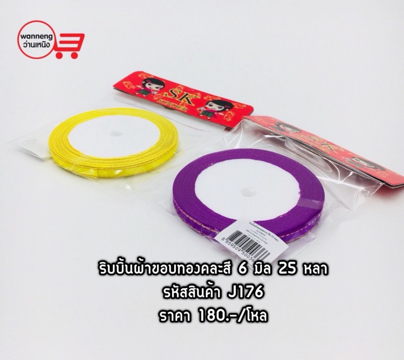 J176 ริบบิ้นผ้าขอบทองคละสี 6มิล 25 หลา 1 โหล